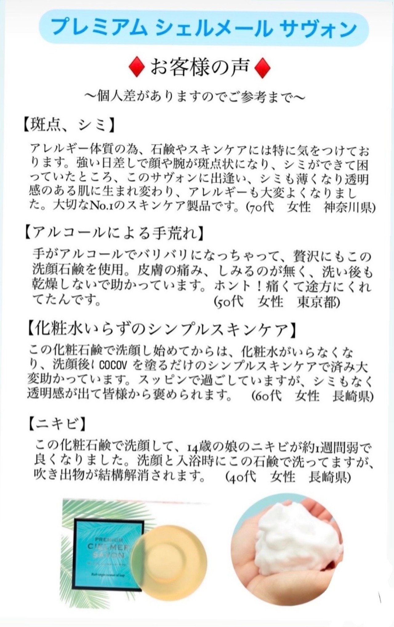 *私は肌が弱く、石鹸オタクで、8.000円する石鹸をはじめ色々沢山使ってきましたが、シェルメールサヴォンは、とても私の肌に合い、この出会いを嬉しく思ってます。ずーっと使い続けたいと思っています。