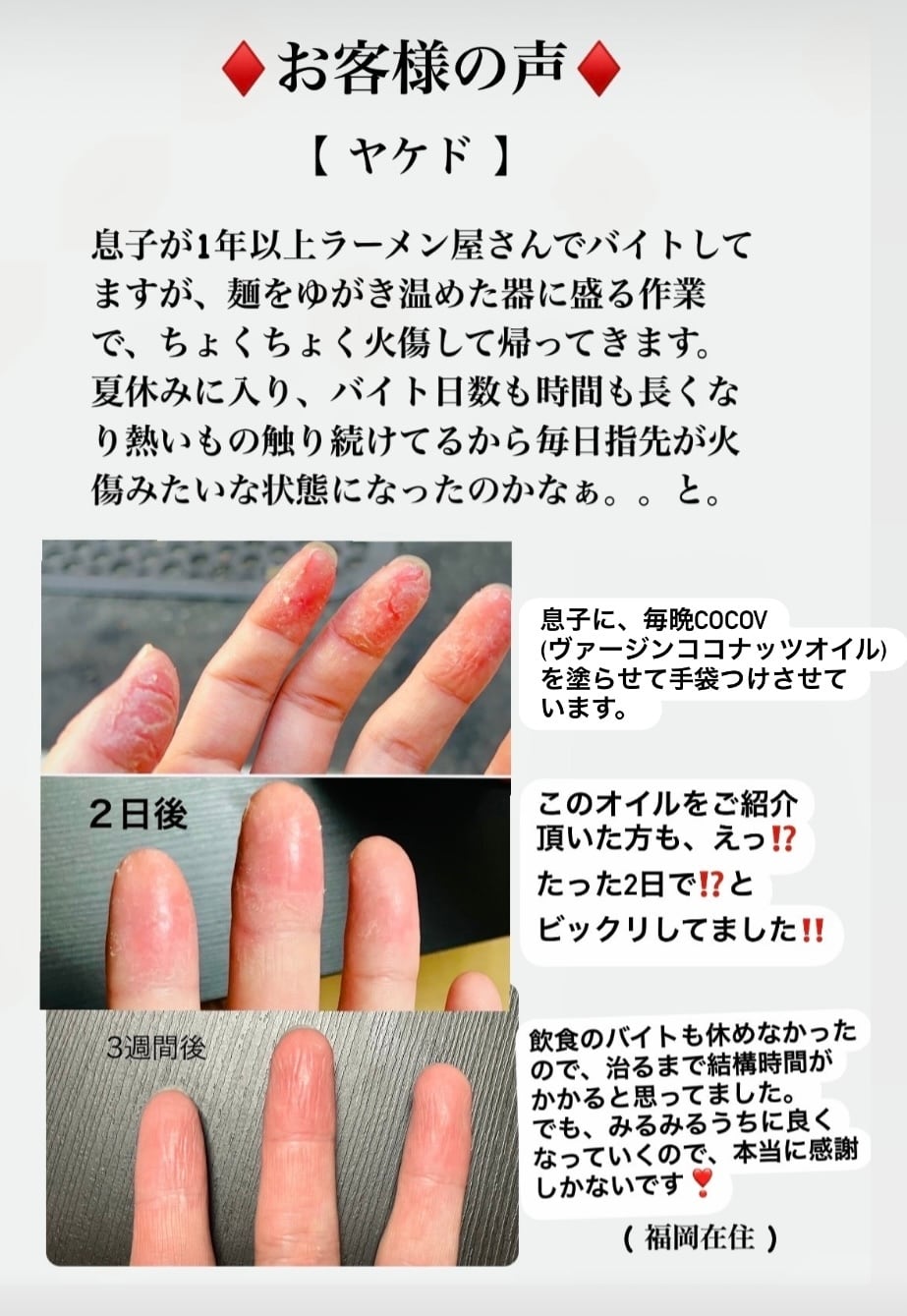 ✴︎料理をしながら、時々ヤケドをし皮膚が黒くなってるのに気付き、直ぐにCOCOVを塗りますが、翌日には皮膚がピンク色に変わり、凄いと感じてます。きれいに良くなりました。COCOVは、ホンモノだと確信しました。