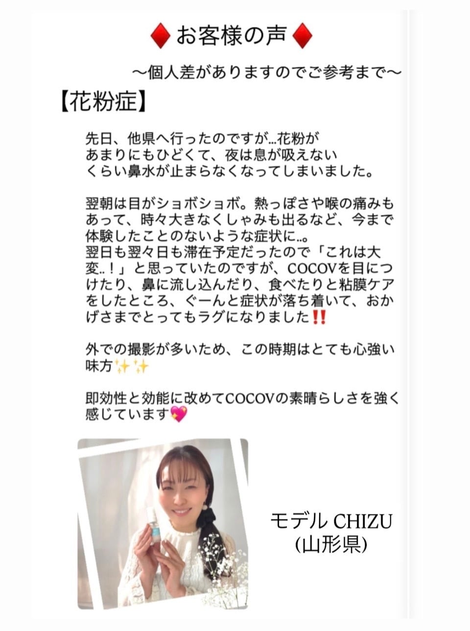 ✴︎長年アトピーで悩んでましたが、COCOVをお顔に付けだして、4年になり、お肌が柔らかくなり透明感も出てきてエステの先生から褒められるようになりました。